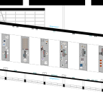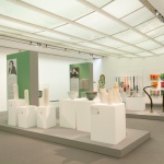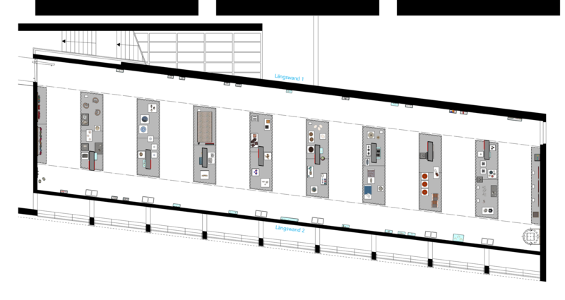 Erreicht wurde dies durch eine Reihung von Wandscheiben, die einen Gegenwinkel zu dem raumeigenen 7-Grad Winkel bildet. Dadurch wird der Raum in zwei gleichwertige durchlässige Dreiecke geteilt. Die Wandscheiben wiederum sind eingebettet in acht gleiche parallelogrammförmige Podeste, die eine Quererschließung des Raumes erlauben und so die gewünschte Gliederung ermöglichen. Bei der Bewegung quer zur Längsachse führt der Weg zu kleinteiligen Objektgruppen in Wandvitrinen auf der ideal beleuchteten Längswand.